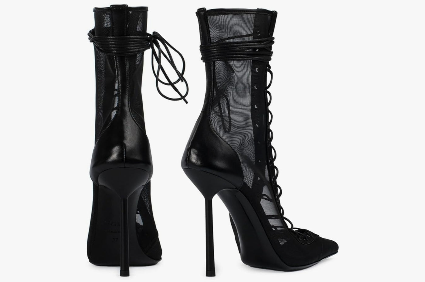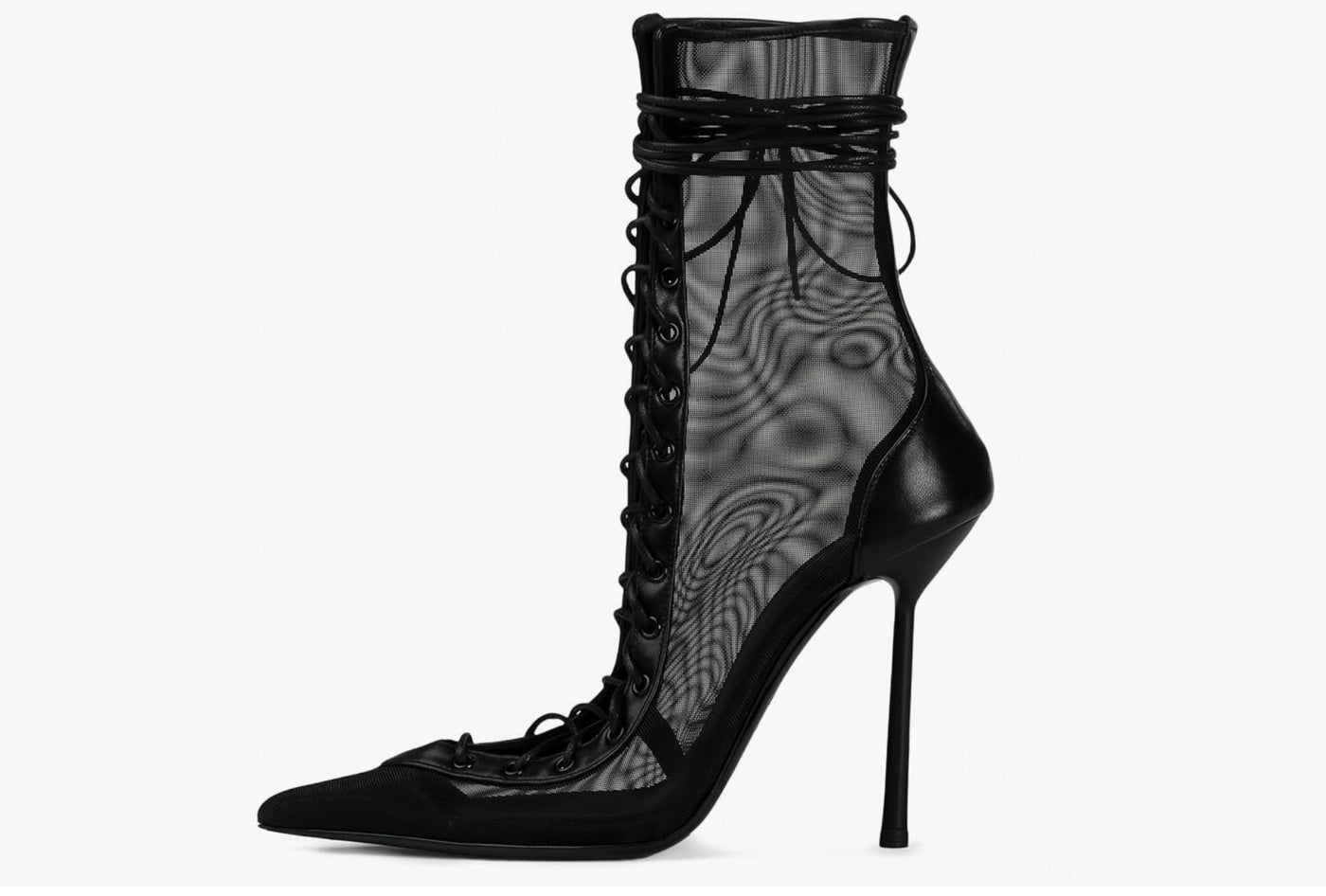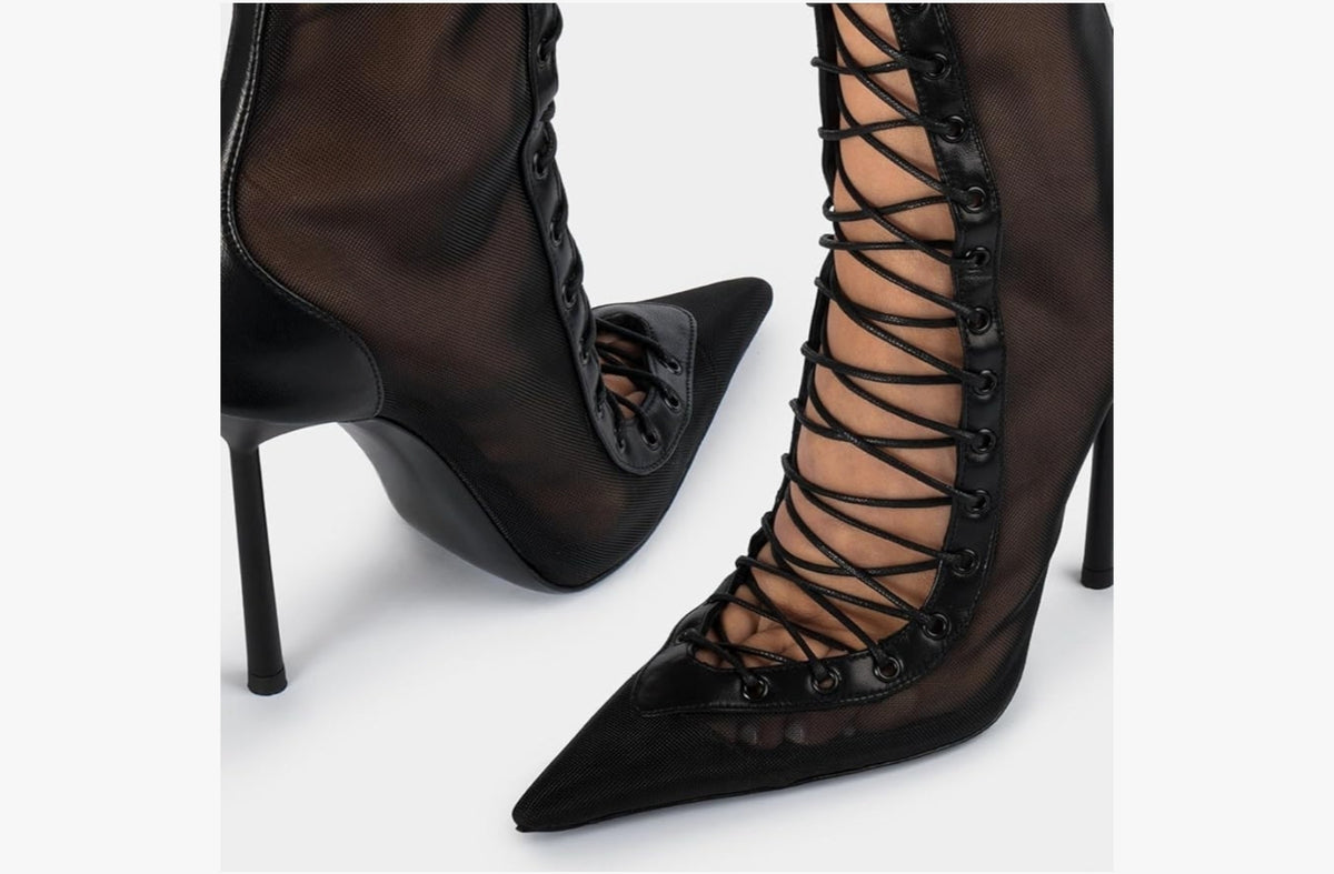 Diese kniehohen Stiefel sind ein absoluter Hingucker und vereinen Eleganz mit einem Hauch Extravaganz. Das Design mit transparenter Mesh-Optik, spitzer...