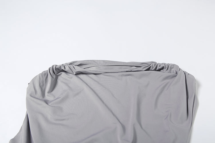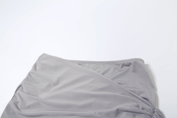 Ein besonderes Highlight ist das lange, fließende Drapier-Detail am Rock, das für eine dynamische und feminine Silhouette sorgt. Hergestellt aus weichem, nahtlosem und elastischem Material in Hellgrau, schmiegt sich das Set perfekt an den Körper an. Ideal für Partys oder besondere Anlässe.