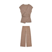 Die Hose hat einen hohen Bund und besticht durch die seitliche Drapierung sowie einen Cut-Out, der von einem geflochtenen Detail akzentuiert wird. Aus einem weichen, fließenden Material in einem eleganten Grauton gefertigt, ist dieses Set perfekt für Abendveranstaltungen oder stilvolle Partys.
